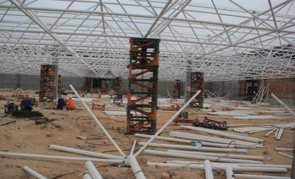 5)总体晋职法:此步履多使用在周边支护以及有多点支护的网架结构,可采取平板升降机、液压千斤顶等小型机具作业邓州施工;